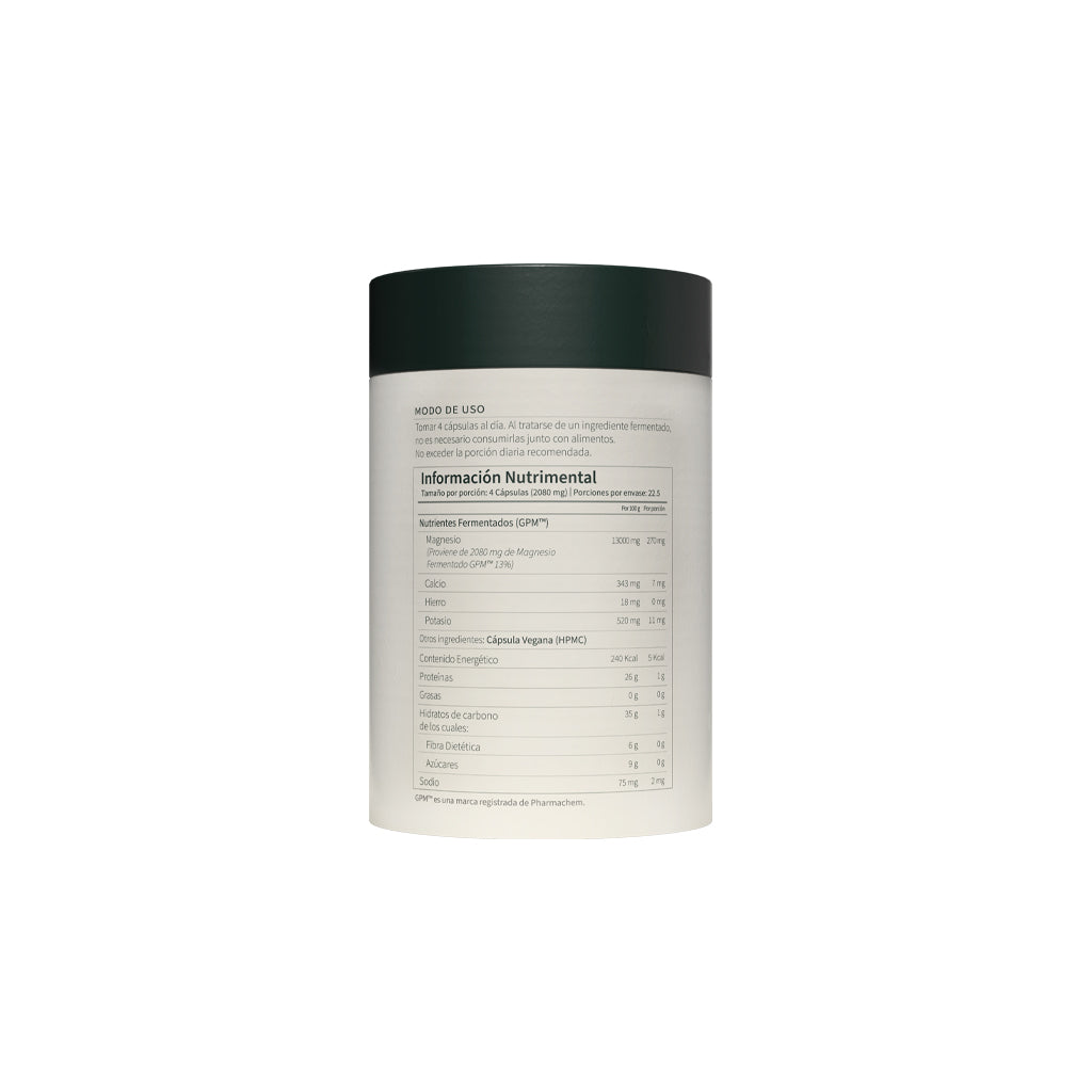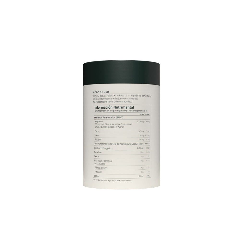 Esta fórmula única aporta magnesio en su forma más pura y biodisponible, elaborado a partir de Nutrientes Fermentados (GPM™). Gracias a su proceso de fermentación con probióticos y levaduras, se obtiene una matriz alimenticia que el cuerpo reconoce como si proviniera de los alimentos, mejorando su absorción y tolerancia incluso en estómagos sensibles.